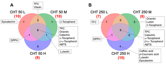 Venn diagram for differentially accumulated metabolites (DAMs) detected in the inflorescences of the hemp plants from the cv. Codimono treated with CHT solutions at 50 mg/L (A) and 250 mg/L concentrations (B). Numbers in parentheses indicate the total DAM number induced by each treatment. TPC, total phenolic content; TFC, total flavonoid content; ABTS, 2,2-azinobis-(3-ethylbenzothiazoline-6-sulphonic acid) radical scavenging activity; DPPH, 2,2-diphenyl-1-picrylhydrazyl radical scavenging activity. CHT 50 L, 50 mg/L low molecular weight chitosan; CHT 50 M, 50 mg/L medium molecular weight chitosan; CHT 50 H, 50 mg/L high molecular weight chitosan; CHT 250 L, 250 mg/L low molecular weight chitosan; CHT 250 M, 250 mg/L medium molecular weight chitosan; CHT 250 H, 250 mg/L high molecular weight chitosan.