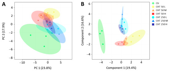 Principal component analysis (PCA) (A) and sparse partial least-squares-discriminant analysis (sPLS-DA) (B) for the traits investigated in the inflorescences of the hemp plants from the cv. Codimono treated with CHT solutions at 50 mg/L and 250 mg/L concentration. The percentages of total variance represented by the first two components are shown in parentheses. Ctr, control; CHT 50 L, 50 mg/L low molecular weight chitosan; CHT 50 M, 50 mg/L medium molecular weight chitosan; CHT 50 H, 50 mg/L high molecular weight chitosan; CHT 250 L, 250 mg/L low molecular weight chitosan; CHT 250 M, 250 mg/L medium molecular weight chitosan; CHT 250 H, 250 mg/L high molecular weight chitosan.