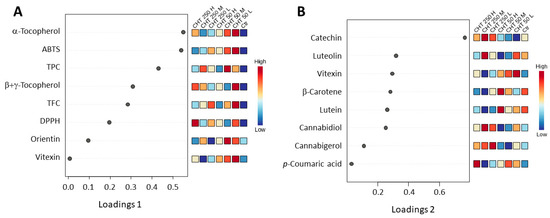 Loading plots were also used to reveal which variables were most responsible for the separation observed in the sPLS-DA score plot (Figure 6). As shown in Figure 6A, the eight traits selected by the sPLS-DA model on the first component were those that were significantly induced by CHT treatments. In particular, the TPC, the α-tocopherol and β+γ-tocopherol contents, and the ABTS radical scavenging activity, which were significantly induced by all the CHT treatments (see Figure 4), ranked in the first four positions, thus revealing that these traits were the main traits responsible for the separation of the control group from the CHT-treated groups on the first component. A separation of the CHT 50 L from the other treatments was also observed, due to the highest levels detected in this treatment for the eight traits selected on the first component.