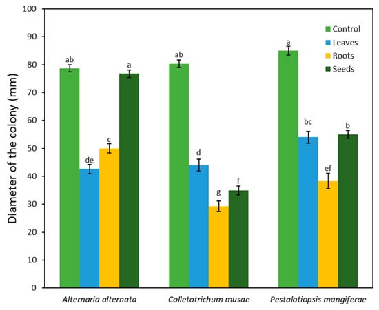 The antifungal potential of Artemisia monosperma. The leaf, root, and seed extracts showed significant antifungal activity against three selected fungal species showed in terms of radial mycelial growth. Each column represents the mean of 5 replicates. Error bars show the standard deviation of their respective mean. Columns with the same letter are not significantly different (p ≤ 0.05).