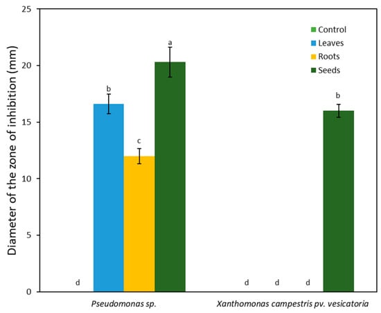 Extracts from the leaves, roots, and seeds of A. monosperma significantly inhibited the growth of Pseudomonas sp., while inhibition against Xanthomonas campestris pv. vesicatoria was minimal. The mean diameters of the inhibition zones for Pseudomonas sp. by leaf, root, and seed extracts were 16.60, 12.00, and 20.30 mm, respectively (Figure 2). Xanthomonas campestris pv. vesicatoria was not inhibited by the root and leaf extracts, but treatment with seed extract resulted in an inhibition zone of 16.00 mm.