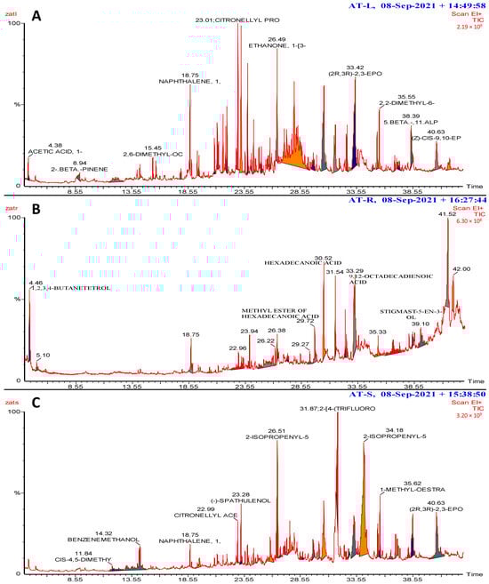 GC-MS spectrum showing some of the identified compounds in the extracts of leaves (A), roots (B), and seeds (C) of Artemisia monosperma. The full list of the identified compounds in each extract along with their retention time and area values is in the Supplementary Table S1.