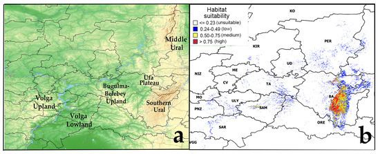 In contrast to the main territory of the Volga Upland, the habitats with high suitability are found on its border with the Volga Lowland in the Samara region (in the Zhigulevsky Nature Reserve and the Samarskaya Luka National Park). In this area, pine-broadleaf forests are located on flat sites and form the ecotone vegetation between mountain mossy or herb-rich pine forests and thermophilous oak forests. The floristic composition of these forests is characterized by a high proportion of steppe species [62].