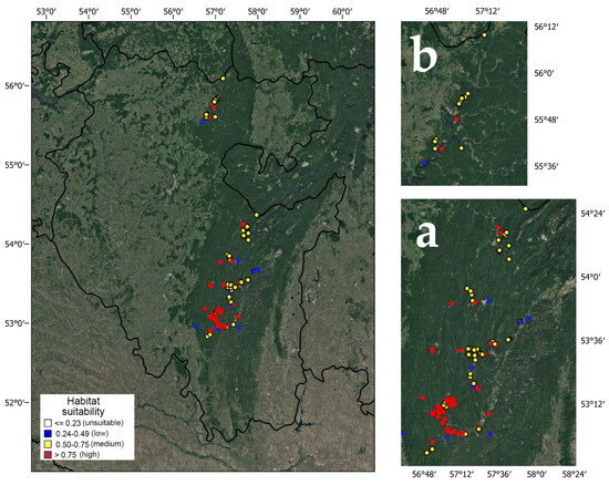 Figure 2. Habitat suitability in pine-broadleaf forests of suballiance Tilio-Pinenion in the Southern Ural (a) and the Ufa Plateau (b).