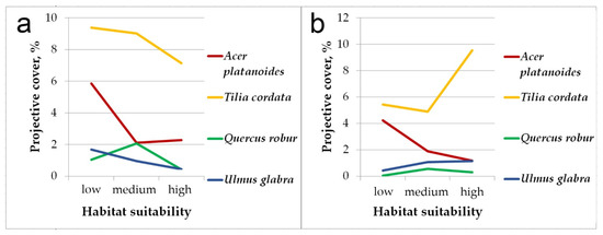 Figure 3. The differences in total projective cover of broad-leaved species in the pine-broadleaf forests located in the habitats with different suitability: (a)—general tree layer and large undergrowth, (b)—small undergrowth.