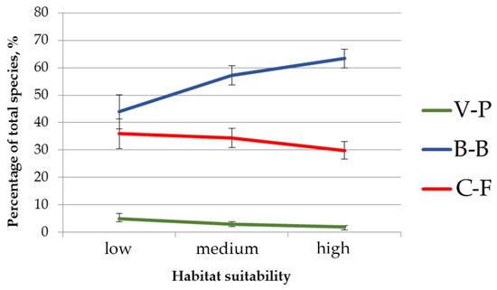 Figure 4. The proportion of species typical for different vegetation classes in the herb layer of pine-broadleaf forests growing in the habitats with different degrees of suitability. Note: C-F—mesic deciduous and mixed forests of the class Carpino-Fagetea, B-B—hemiboreal pine and birch-pine herb-rich open forests of the class Brachypodio-Betuletea, V-P—coniferous boreal taiga forests of the class Vaccinio-Piceetea.