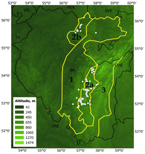 Figure 7. Territory of maximum distribution of pine-broadleaf forests: 1—distribution area of deciduous forests in the Southern Ural; 2a—distribution area of pine-broadleaf forests in the Southern Ural; 2b—distribution area of pine-broadleaf forests on the Ufa Plateau; 3—distribution area of pine-larch coniferous forest in the Southern Ural; white circles are images of forest vegetation.