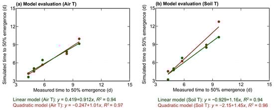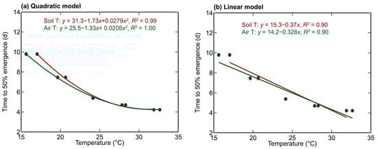 4.2. Quadratic Function Better Represented the Variation in the T50% with Temperature
