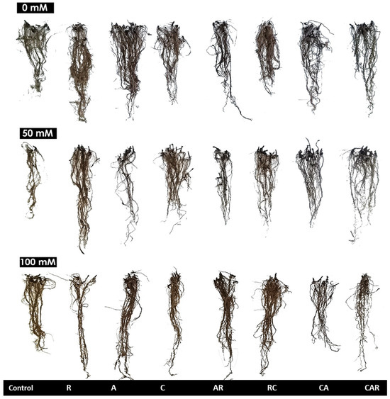 Effect of salinity (0, 50, and 100 mM NaCl) on the root system of sweet corn. The treatments included control plants, sweet corn plants amended and inoculated with single biostimulants (compost (C), native arbuscular mycorrhizal fungi consortium (A), and bacterial consortium (R)), double combinations (AR: AMF + R consortia, RC: R consortium + compost, CA: compost + AMF consortium), and a triple combination (CAR: compost + AMF + R consortia).