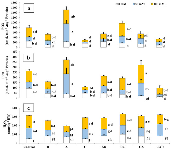 Influence of different salinity levels (0, 50, and 100 mM NaCl) and biostimulant applications on (a) POX: peroxidase, (b) PPO: polyphenoloxidase, and (c) H2O2: hydrogen peroxide in sweet corn. The treatments included control plants, sweet corn plants amended and inoculated with single biostimulants (compost (C), native arbuscular mycorrhizal fungi consortium (A), and bacterial consortium (R)), double combinations (AR: AMF + R consortia, RC: R consortium + compost, CA: compost + AMF consortium), and a triple combination (CAR: compost + AMF + R consortia). The data represent the mean ± SE of 5 biological replicates. Means with the same letter are not significantly different at p < 0.05 (Tukey’s HSD).
