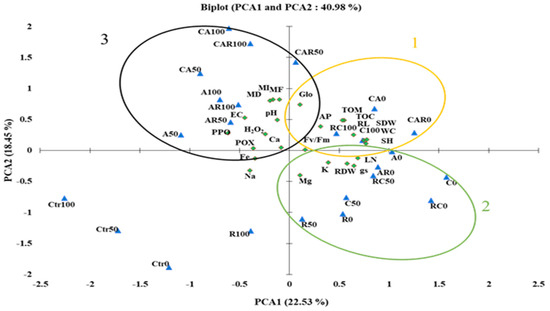 The study employed PCA analyses to examine the salt stress response and its correlations with the traits analyzed, and to identify the best treatments (Figure 4). The PCA revealed that the traits and treatments were associated (41%) with PCA1 and PCA2, of which PCA1 was the major component (23%). Strong positive correlations were found between growth (SDW, RL, and SH), physiological (Fv/Fm and WC), and soil physico–chemical (AP, Glo, TOM, and TOC) parameters in the presence of CA, CAR, and A under normal conditions (circle 1; yellow color). K and Mg showed a positive correlation with the growth (RDW and LN) and physiological (gs) parameters (circle 2; green color) in the presence of AR and RC under normal and MS conditions, respectively. Conversely, the 100 mM NaCl, H2O2, POX, PPO, and mycorrhization parameters (MD, MI, and MF) were positively correlated with the PCA2 axis (circle 3; black color). Fe and Na were negatively correlated with LN, RDW, K, and Mg on the PCA axis.