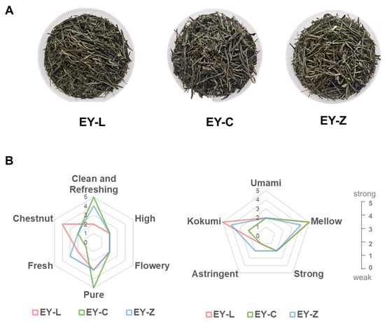 Figure 1A presents the appearance and color of the three Enshi Yulu tea samples derived from the tea cultivars Longjing 43 (EY-L), Xiapu Chunbolv (EY-C), and Zhangcha 108 (EY-Z). Following a sensory evaluation and expert panel discussion, six aroma attributes and five taste attributes were identified, as depicted in Figure 1B. In the evaluation of aroma, “clean and refreshing” along with “pure” emerged as prominent descriptors, with EY-C receiving the highest score. In comparison to other steamed green teas, EY-L exhibited a distinctive chestnut flavor, while EY-Z evoked a stronger fresh odor note. Additionally, the evaluation of high and flowery aromas at lower intensity revealed no significant differences among the three tea samples.