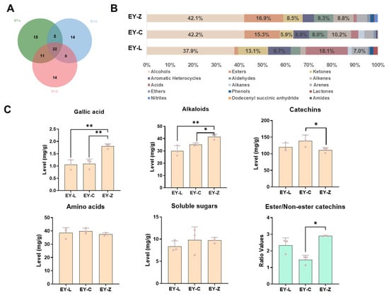 Overall chemical profiles of Enshi Yulu. (A) Venn diagram of volatile compounds. (B) Relative content percentage of volatile composition. (C) Total content/ratio of non-volatile compounds. * and ** represent significant difference (p < 0.05) and extremely significant difference (p < 0.01), respectively.