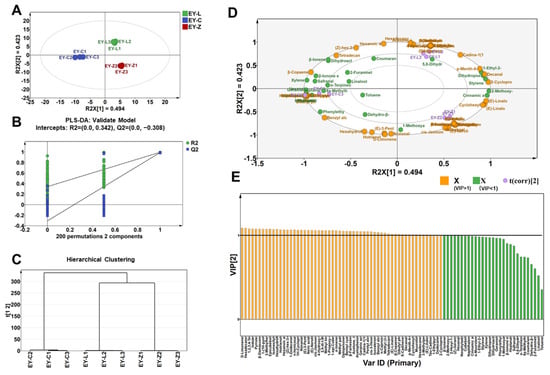 EY-L, EY-C, and EY-Z were clearly distinguished using PLS-DA, revealing variations in volatile composition among the different tea cultivars. The extracted first two principal components can explain more than 90% of the variation. EY-L, EY-C, and EY-Z were situated in quadrants 1, 3, and 4, respectively (Figure 3A), which exhibited significant differentiation. Through a permutation test involving 200 calculations, cross-validation outcomes were obtained (Figure 3B). The model demonstrated the intercepts of R2 and Q2, which were 0.342 and −0.308, respectively, confirming its reliability and ruling out overfitting. Furthermore, the results of HCA suggested that EY-L and EY-Z exhibited a higher degree of similarity (Figure 3C), which aligned with the fact that Zhongcha 108 was derived from Longjing 43 through irradiation []. The biplot (Figure 3D) provides a detailed representation of the clusters associated with volatile compounds related to EY-C, EY-L, and EY-Z. To further clarify the specific differences in aroma composition among cultivars, key variables were screened based on the criterion of variable importance in the projection (VIP) >1 and p < 0.05 (Figure 3E). This screening process aimed to identify the significant variables contributing to the discrimination among the cultivars, allowing for a more detailed understanding of their aroma composition.