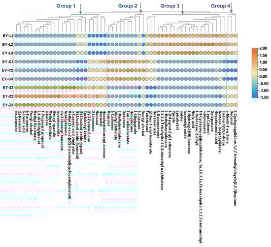 A total of 58 distinct volatile compounds were identified, including 11 ketones, 10 alcohols, 9 esters, 8 alkenes, 6 alkanes, 3 acids, 3 aromatic heterocycles, 2 arenes, 2 aldehydes, 2 nitriles, 1 lactone and 1 phenol. These compounds were subjected to heat map clustering analysis, resulting in the formation of four noticeable aroma groups (Figure 4). Group 1 consisted of 24 volatile compounds closely associated with EY-Z, predominantly evoking floral or green notes, such as acetophenone, (E)-nerolidol, cis-jasmone, (E)-linalool oxide (furanoid), hexahydrofarnesyl acetone, cis-3-hexenyl benzoate, and geranic acid. Additionally, hexahydrofarnesyl acetone, hotrienol, nonanal, D-limonene, and (E)-3-penten-2-one were also identified in EY-C, albeit at lower levels. Cyclohexyl ketone, (E)-linalool oxide (pyran), and (E)-linalool oxide (furanoid) were found in EY-L, but in smaller quantities. Group 2 comprised 10 components specifically linked to EY-C, primarily sesquiterpenes and their derived alcohols and esters, such as β-copaene, δ-cadinene muurolol, and τ-cadinol acetate. Group 3 encompassed compounds predominantly associated with EY-L, including 21 substances. Some acids involved can evoke a waxy odor, such as hexadecanoic acid, and some ketones, like acetone, isopropylidene, and isomesityl oxide, elicited vegetable odor notes. Group 4 contained only three compounds identified in both EY-L and EY-Z, indicating the similarity of the two tea cultivars.