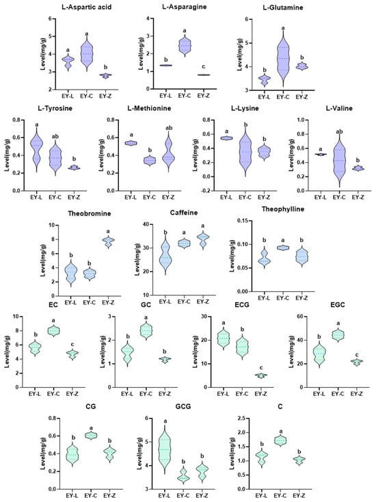 Further analysis screened 18 differentiated non-volatile components through one-way ANOVA, including 7 amino acids, 7 catechins, 3 alkaloids, and gallic acid (Figure 5). For all amino acids, both EY-L and EY-C exhibited heightened concentrations compared to EY-Z. Notably, EY-C stood out with significantly elevated levels of L-aspartic acid, L-asparagine, and L-glutamine, while EY-L showcased notably higher content of L-tyrosine, L-methionine, and L-lysine. Among the alkaloids, EY-Z featured significantly higher levels of theobromine and caffeine compared to the other two cultivars. Regarding catechins, EY-C presented significantly greater concentrations of non-ester catechins than the other two varieties. EY-L demonstrated a marked prominence in ECG and GCG, whereas EY-Z exhibited relatively lower overall catechin content. The results obtained from the SPSS analysis align harmoniously with previous sensory evaluations and analyses, thereby further refining our understanding of these taste distinctions.
