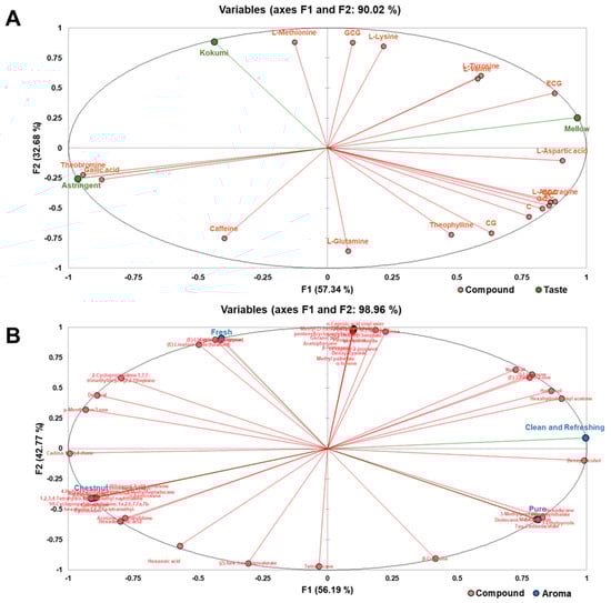 MFA-loading plot of sensory traits and key chemical contributors. (A) Taste traits and characteristic non-volatile compounds. (B) Aroma traits and characteristic volatile compounds.