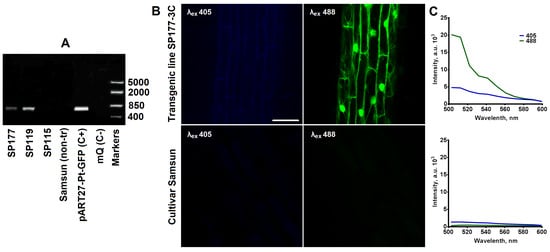 The analysis of untransformed and transformed plants of tobacco for the presence of the Pt-GFP gene and fluorescence of cells. (A) Result of PCR analysis. The primers for the PCR were designed to amplify a 464 bp fragment of the Pt-GFP gene. (C+)—a positive control with a cloning binary vector plasmid, mQ (C−)—negative control, SP177, SP119, SP115—transformed lines of tobacco cv. Samsun, Samsun (non-tr)—untransformed tobacco cv. Samsun. (B) Confocal images of root cells of the SP177-3C transgenic plant and cv. Samsun (λem 500–550 nm) with excitation at λex 405 nm or λex 488 nm. Scale bar, 50 μm. (C) Spectra of fluorescence of root cells of the SP177-3C transgenic plant and cv. Samsun with excitation at λex 405 nm or λex 488 nm.