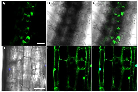 Analysis of Pt-GFP localization in cells of the transgenic line SP177-3C expressing Pt-GFP. (A–C) Cap plasmolysis. Eleven-day-old transgenic plants were incubated with 1 M KNO3. (A) Fluorescent image (λem 500–550 nm) with excitation at λex 488 nm. (B) Transmitted light image. (C) Merged fluorescent and transmitted light images. (D–F) Nuclei were stained with 0.5 μg/mL DAPI (blue fluorescence). (D) Merged transmitted light image and fluorescence image (λem 415–455 nm) with excitation λex 405 nm. (E) Fluorescent image (λem 500–550 nm) with excitation λex 488 nm. (F) Merged fluorescent images of DAPI and Pt-GFP signals. Bars, 50 μm.