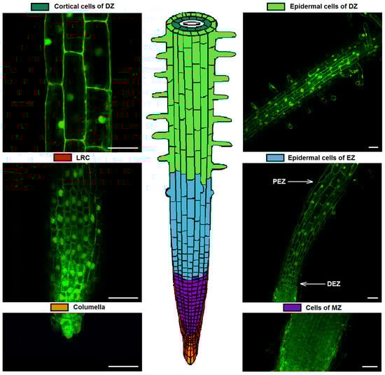 The scheme of tobacco root with LSM images of studied root cells of transgenic tobacco plants. LSM images (λem 505–525nm) with excitation λex 488 nm are represented. DZ, differentiation zone; LRC, lateral root cap cells; EZ, elongation zone; DEZ; distal cells of elongation zone; PEZ, proximal cells elongation zone; MZ, meristem zone. Scale bar, 50 μm.