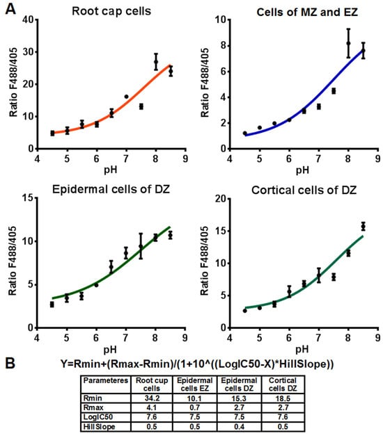 The ratio of fluorescent signals F488/F405 in cells of various root zones varies (Figure S2). These differences may be a result of physical and chemical properties of the cytoplasm and cell wall in various plant cells, and these properties can affect the fluorescent signal of the pH sensor Pt-GFP. According to the level of the ratio F488/F405 and the depth of cell locations, studied root cells can be divided into four groups: root cap cells (columella and LRC), cells at the development stages of division and expansion (MZ and EZ), epidermal cells of the DZ and cortical cells of the DZ. Calibration curves of the ratio F488/F405 versus pH of the cytosol and the corresponding equations were obtained for each of these groups (Figure 4).