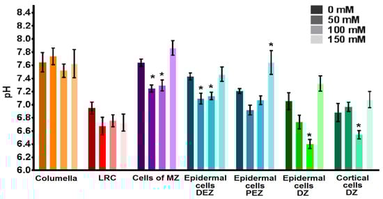 The cytosolic pH value of cells in various root zones varied, so pHcyt of the columella cells and LRC was 7.6 and 7.0, respectively (Figure 5). In the cells of the MZ, pHcyt was 7.6. Cytosolic pH in the DEZ cells was more alkaline (7.4) than in the PEZ cells (7.2). The cortical cells of the DZ had a slightly more acidic cytosol pH of 6.9, compared with pHcyt of the epidermal cells of the DZ of 7.1.