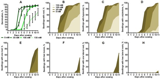The dynamics of seed germination and plant development were analyzed during cultivation of the transgenic tobacco plants on media with different concentrations of salt for 11 days. Seed germination on MS medium with 0 mM NaCl exceeded 80% on the fourth day and reached almost 100% on the seventh day after sowing (Figure 6A). Seed germination on a medium containing 50 mM NaCl was delayed by 1 day after sowing compared to the control, commencing on the fourth day. At the same time, approximately 80% of the seeds germinated on the sixth day, and nearly 100% of the seeds germinated on the eighth day after sowing on the medium with 50 mM NaCl. The dynamics of seed germination on media with 100 mM NaCl were similar to the dynamics of seed germination on a medium with 50 mM NaCl, with a delay of 2 days. In the presence of 150 mM NaCl in the media, seed germination significantly slowed down and reached only 71% by the final day of measurements. Salinity also significantly influenced the development of seedlings. Approximately 100% of seedlings grown without salt had a primary root, hypocotyl and cotyledons by the eleventh day after sowing (Figure 6B–D). Eighty-three percent of them had one or two leaves, and 66% had lateral roots (Figure 6E–H). Around 100% of seedlings grown on media with 50 and 100 mM NaCl also had primary root, hypocotyl and cotyledons by the eleventh day after sowing. However, only 78% of seedlings in the presence of 50 mM NaCl had one leaf, while seedlings in the presence of 100 mM NaCl had not yet sprouted leaves. Only 57% of seedlings treated with 150 mM NaCl had a primary root and hypocotyl, and 22% of them had cotyledons. None of the seedlings grown under chronic salinity conditions had lateral roots. The peak time for hypocotyl formation was observed in seedlings on medium with 0 mM NaCl at 4–6 days after sowing; on media with 50 mM NaCl, at 4–7 days; on media with 100 mM NaCl, at 6–7 days; and on media with 150 mM NaCl, at 8–11 days. In most seedlings, cotyledons appeared on a medium without salt by the 5th to 7th days after sowing; on a medium with 50 mM NaCl, by the 6th to 8th days; on a medium with 100 mM NaCl, by the 8th to 11th days; and on a medium with 150 mM, by the 10th day.