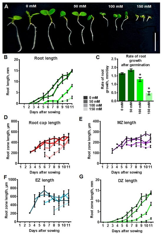 The MZ of seedlings grown with 50 mM NaCl reached a maximum length of 215–255 µm on the sixth day after germination (Figure 7E). The length of the MZ of seedlings growing in the presence of 100 and 150 mM NaCl in media remained unchanged throughout the observation period, measuring 189–207 and 149–170 µm, respectively. These measurements were about 23–49 and 60–89 µm less than the MZ of control plants. On the eleventh day after sowing the MZ was smaller in plants grown with 100 and 150 mM NaCl compared with the control by 56 and 101 µm, respectively (p < 0.05). The EZ of seedlings growing with 50 and 100 mM NaCl did not change in length during the investigation (Figure 7F). It should be noted that their EZ length was slightly longer than that of control plants by the eleventh day. In the case of 150 mM NaCl, the EZ gradually increased, and its length also became comparable to the control plants by the eleventh day.