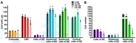 The next step was to determine the cell number in the MZ, EZ and DZ. Under control conditions, the MZ comprised 32 cells (Figure 8B). The number of cells in this zone decreased only in seedlings grown with 100 and 150 mM NaCl, by 7 and 17 cells, respectively (p < 0.05). The cell number of the EZ also decreased in roots of seedlings grown in the presence 100 and 150 mM NaCl, from 10 under control conditions to 8 and 6 under salinity conditions, respectively (p < 0.05). The cell number of the DZ of roots at all studied NaCl concentrations was reduced from 134 cells to 118 (50 mM NaCl), 55 (100 mM NaCl) and 23 cells (150 mM NaCl).