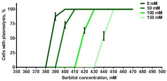 The increase in the cell length may result from their enhanced ability to absorb water. An increase in osmolytes concentration in the vacuole and cytosol can enhance a cell water-absorbing capacity. We can indirectly assess the change in the ability to absorb water in root cells of transgenic tobacco seedlings grown under salinization conditions using the phenomenon of plasmolysis. In plants grown under control conditions, plasmolysis occurred during incubation in a solution of 0.39 M sorbitol solution (Figure 9). The presence of NaCl in the growth medium enhanced the cell ability to absorb water, as plasmolysis in the root cells of transgenic tobacco plants occurred at higher concentrations of sorbitol with an increase in NaCl concentration. Consequently, plasmolysis in cells of plants grown at 50 mM NaCl occurred at 0.40 M sorbitol; at 100 mM NaCl, at 0.42 M sorbitol; and 150 mM NaCl, at 0.44 M sorbitol. Accordingly, with an increase in the NaCl concentration in the medium, the cell’s ability to absorb water also increased.