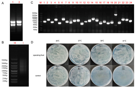 Potato cDNA library construction and high-temperature screening. (A) Total RNA was isolated from the whole potato plants, M: Maker; 1–2: Potato sample RNA; (B) Detection of synthesized cDNA quality, M: Maker; 1: Mixed purification results of three types of ds cDNA; (C) Detection of cDNA library inserts by PCR using pYES2-F and pYES2-R primers, M: Maker, 1–24: Randomly selected 24 clones for PCR detection; (D) Yeast libraries were treated at 37 °C, 39 °C, and 40 °C, and 39 °C was selected for treatment and sequencing.