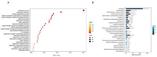 KEGG and GO analysis of genes responsive to high-temperature stress. (A) Biological processes of segregating genes; (B) KEGG pathway enrichment of isolated genes. Circle areas represent the relative numbers of isolated genes in the pathway; circle colors represent the range of Q values.