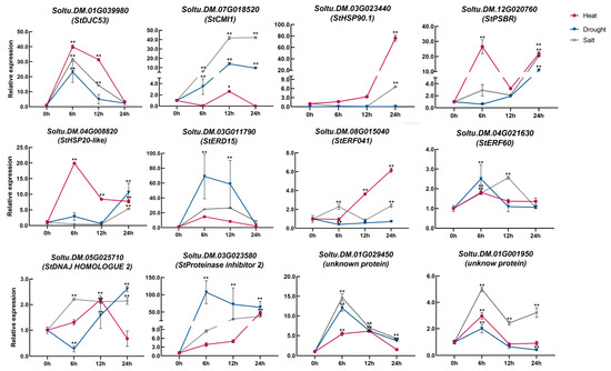 Expression patterns of candidate genes for heat resistance in potato subjected to different stress treatments. Two-week-old potato seedlings were treated with 35 °C, 120 mM NaCl, and 20% PEG 6000, and samples were taken at 0 h, 6 h, 12 h, and 24 h. StEF1α was used as a control with three independent biological replicates. Red, blue, and gray represent heat stress, drought stress, and salt stress, respectively. *: p < 0.05; **: p < 0.01.