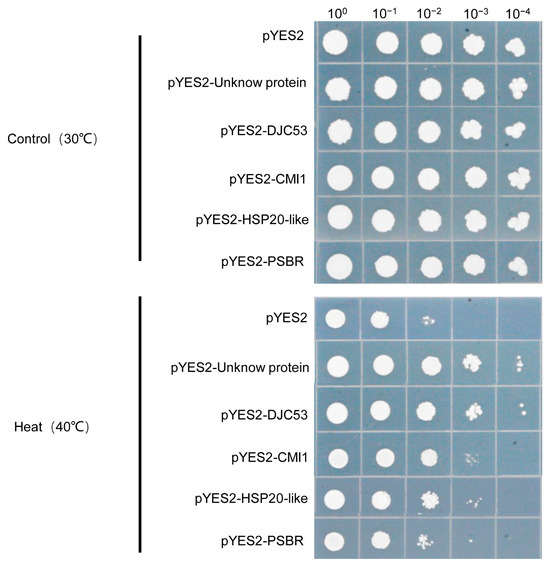 To further verify the accuracy of the screened high-temperature candidate genes, five genes were randomly selected for high-temperature stress validation in Saccharomyces cerevisiae. They were cloned into the pYES2 vector and transformed into S. cerevisiae BY4741 for high-temperature stress. There were no significant differences in growth among the five transgenic S. cerevisiae under normal growth conditions compared with the empty vector, while S. cerevisiae with over-expression of DJC53, HSP20-like, PSBR, CMI1, and hypothetical protein genes had a significantly higher survival rate compared to S. cerevisiae with the empty vector under 40 °C (Figure 5). In summary, the five genes significantly enhanced S. cerevisiae, proving that the screened genes were effective.
