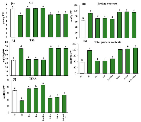 2.5. Osmolytes Response under Salinity Stress and Algal Extracts Application