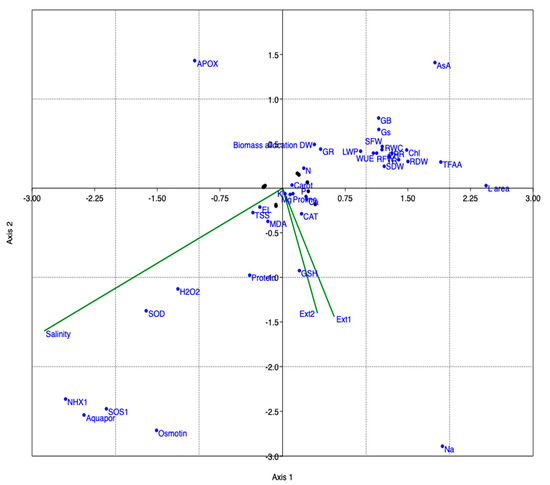 - Ali, M.M.; Jeddi, K.; Attia, M.S.; Elsayed, S.M.; Yusuf, M.; Osman, M.S.; Soliman, M.H.; Hessini, K. Wuxal amino (Bio stimulant) improved growth and physiological performance of tomato plants under salinity stress through adaptive mechanisms and antioxidant potential. Saudi J. Biol. Sci. 2021, 28, 3204–3213. [Google Scholar] [CrossRef]