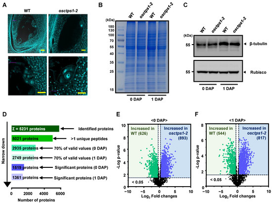 Comparison of differentially accumulated proteins between WT and osctps1-2 in 0 and 1 DAP seeds. (A) Nuclear division phenotype in WT and osctps1-2 at 1 DAP. Bars = 30 µm. (B) SDS-PAGE of total proteins isolated from 0 and 1 DAP seeds of WT and osctps1-2 mutants. Loaded samples contained 30 µg of total proteins. (C) Western blot analysis using β-tubulin and Rubisco antibodies. Label-free quantitative proteomic analysis of 0 and 1 DAP seeds. (D) Schematic representation of the total number of proteins identified and the proteins validated by the narrow-down approaches. (E,F) A volcano plot of differently modulated proteins in WT and osctps1-2 mutant seeds at 0 DAP (E) and 1 DAP (F).