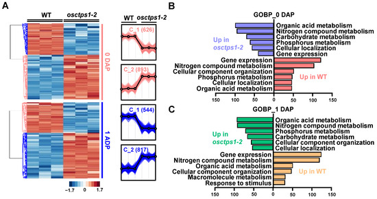 Comparison of differentially accumulated proteins between WT and osctps1-2 in 0 and 1 DAP seeds. (A) Hierarchical clustering analysis of differentially modulated proteins identified using a label-free quantitative proteomic approach in 0 and 1 DAP samples. (B,C) Bar charts showing the representative gene ontology biological process (GOBP) term of significantly modulated proteins in WT and osctps1-2 at 0 (B) and 1 DAP (C) using DAVID bioinformatics resources (GO enrichment).