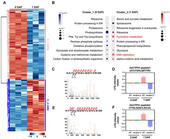 Quantitative proteomic analysis of 0 and 1 DAP of WT seeds. (A) Heat map images of significantly modulated proteins at 0 and 1 DAP in WT. (B) KEGG analysis of differentially accumulated proteins at 0 and 1 DAP seeds. Cluster1 included more accumulated proteins at 0 DAP seeds, and cluster2 included highly accumulated proteins in 1 DAP seeds. (C) The chromatographic peak of OsCTPS1 peptide 1 (ATLFDALQDTVR). (D) LFQ intensity of OsCTPS1 peptide 1 (ATLFDALQDTVR) at 0 and 1 DAP seeds in WT and osctps1-2; n = 3. (E) The chromatographic peak of OsCTPS1 peptide 2 (YTGLSDSYLSVLK). (F) LFQ intensity of OsCTPS1 peptide 2 (YTGLSDSYLSVLK) at 0 and 1 DAP seeds in WT and osctps1-2; n = 3.