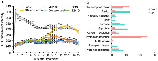 Protoplasts were isolated as previously described [44] with minor modifications. Briefly, etiolated leaves of 10-day-old OsCTPS1-sGFP overexpressing transgenic plants were collected and cut into ~1 mm slices using a sharp blade. The sliced samples were then incubated in a solution (1.5% w/v cellulase RS, 0.5% w/v macerozyme, 0.1% w/v pectolyase, 0.6 M mannitol, 5 mM MES pH 5.7, 10 mM CaCl2, and 0.1% w/v BSA) for 4 h with gentle shaking in the dark. After incubation, an equal volume of a solution (117 mM KCl, 82 mM MgCl2, and 85 mM CaCl2) was added, the cells were harvested, and their protoplasts were resuspended in a solution (0.4 M mannitol, 70 mM KCl, 5 mM MgCl2, and 0.1% w/v MES pH 5.7) at a density of 3 × 106 cells mL−1, as quantified using a haemocytometer. The protoplasts were then incubated with 0.1 μM MG132, 10 nM staurosporine, 100 nM okadaic acid, 10 μg/mL E64d, and 4 μg/mL 6-diazo-5-oxo-L-norleucine (DON) individually. During treatment, GFP fluorescence intensity was measured every 30 min over a 15 h period using a Glomax-Multi Detection System (Promega, Madison, WI, USA; http://www.promega.com, accessed on 10 May 2023).