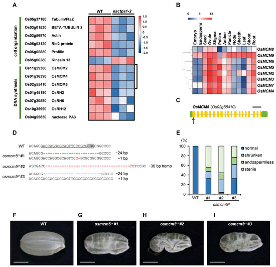 Comparison of differentially accumulated proteins between WT and osctps1-2 in 1 DAP seeds and characterization of OsMCM5 functions in seed development. (A) Heatmap images of protein expression involved in cell organization and DNA synthesis at 1 DAP in WT and osctps1-2 mutants. Cell organization and DNA synthesis groups were selected for functions in endosperm nuclear division. (B) Expression patterns of rice MCM family genes in rice. (C) Schematic representation of the gene structure of OsMCM5. The red arrow indicates the target site of CRISPR/Cas9, green boxs, UTR regions; yellow boxs, exon regions. (D) Sequence alignment of the sgRNA target sequence with altered bases in three independent mutant lines. The target sequence is underlined, and the NGG PAM site is highlighted. Altered DNA sequences are indicated in red. (E) Different seed types caused by the mutation. More than 30 seeds were observed to check the seed phenotypes. The osmcm5 mutant seeds were divided into four main types. (F–I) Phenotypes of WT (F) and osmcm5 mutant seeds (G–I). Scale bars, 2 mm.
