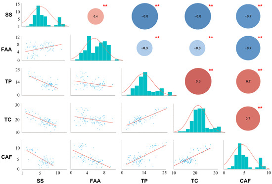 Furthermore, the Pearson correlation coefficient (PCC) between these five normally distributed and important characteristic metabolites (SS, FAA, TP, TC, and CAF) was estimated (Figure 1). Statistically significant differences were shown between every pair of metabolites with p-value < 0.01. There was a strong correlation between most of these metabolites. However, the correlations between FAA and three metabolites (expect for CAF) were weak (|PCC| ≤ 0.40). There was a significant negative correlation between FAA and CAF (PCC = −0.70), indicating that tea infusions with strong umami tend to be less bitter. Then, a significant negative correlation of SS with TP, TC, and CAF was observed (PCC ≥ −0.70), indicating that bitter and astringent tea infusions tend to be less sweet. Interestingly, CAF was positively correlated with TP and TC (PCC = 0.70), suggesting a positive correlation between bitterness and astringency of tea infusion (Figure 1). Additionally, the PCC between all characteristic metabolites was processed (Figure S2). Except for EGC and EC, the correlation between most characteristic metabolites was strong. Interestingly, SS was significantly negatively correlated with almost all metabolites, while there is a strong positive correlation between TP, TC, CAF and most ester catechins. Catechins and polyphenols affect tea taste, and contribute to the astringency of the tea. They are also precursors of theaflavins, which are golden yellow pigments and contribute to tea soup color. Caffeine is also an important factor affecting the quality of tea. It is strongly water soluble and contributes to the bitter taste of the tea. These results showed that high levels of soluble sugar in tea infusion may reduce tea quality and there is a strong correlation between bitterness and astringency in tea soup. All the results indicated that there was a close relationship among these characteristic metabolites, which played an important role in the formation of good quality of tea (Figure S2).