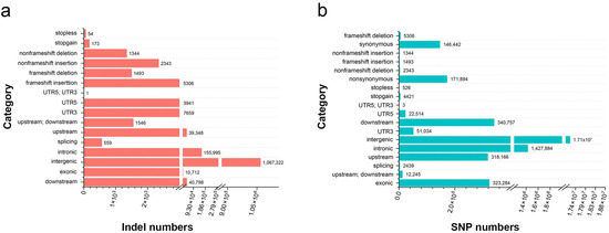 The statistics of indels and SNPs. (a) Statistical analysis of indels in the tea plant genome. (b) Statistical analysis of SNPs in the tea plant genome.