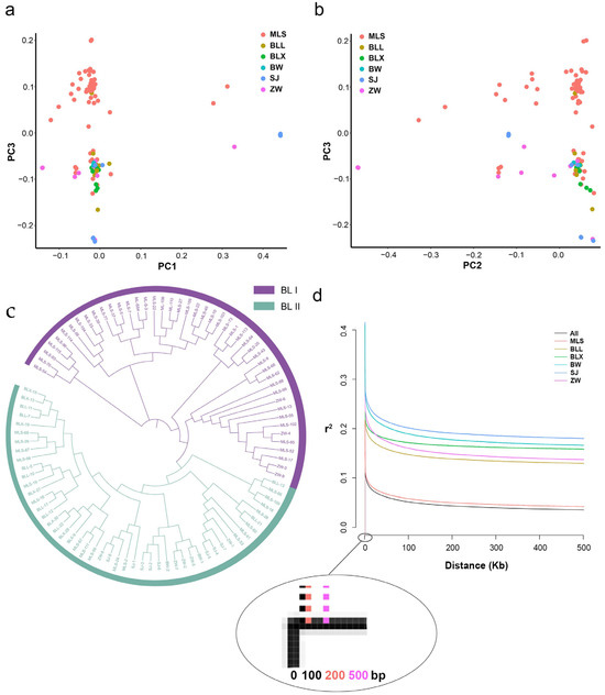 Genetic structure of 95 Biluochun tea plant varieties. (a) PCA plot presents the genetic relationship in tea plant varieties with PC1 and PC3. (b) PCA plot presents the genetic relationship in tea plant varieties with PC2 and PC3. Distribution of Biluochun tea plant varieties: 9 BLL, 7 BLX, 2 BW, 9 ZW, 8 SJ, and 60 MLS. (c) NJ tree of 95 ancient tea plants inferred from filtered SNPs. NJ tree shows the phylogenetic relationship among individuals. Purple members comprise BL I and light green members comprise BL II. BL I contains 46 tea plant individuals and BL II contains 49 tea plant individuals. (d) Genome-wide LD decay is estimated from all populations and six subpopulations. The x-axis represents the physical distance and the y-axis represents the average pairwise correlation coefficient (r2) of SNPs. The black, red, brown, green, cyan, blue, and purple represent All, MLS, BLL, BLX, BW, SJ, and ZW, respectively.