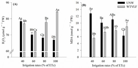 Hydrogen peroxide (H2O2) (A); Lipid peroxidation (MDA) (B); in tomato leaf grown at different irrigation rates with two types of water. Means followed by the same letter, lowercase, compare the types of water treatment and, uppercase, compare the different irrigation rates (p < 0.05) according to Tukey’s test. Error bars indicate the standard deviation of the mean of five replicates.