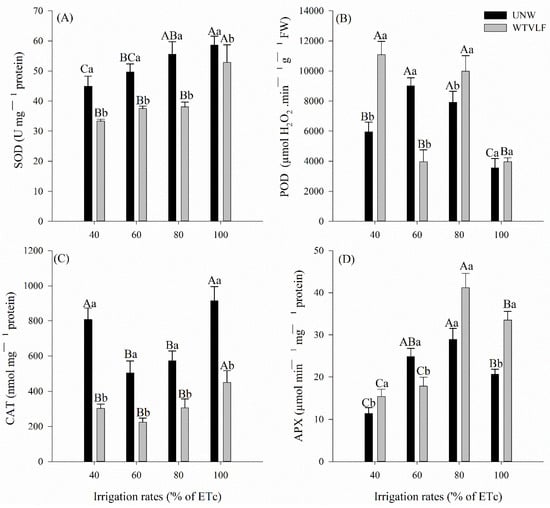 For the POD activity (Figure 2B), there was an antagonistic effect of the irrigation rates, in which there was greater activity at the rates of 40 and 80% ETc when irrigated with UNW and at the rate of 60% ETc when irrigated with WTVLF. For 100% ETc, there was no difference (p > 0.05). Nevertheless, for irrigation with UNW, the 40 and 80% ETc irrigation rates showed higher POD enzyme activity than the 60 and 100% ETc rates. In addition, the use of WTVLF presented superior activity for 60 and 80% ETc, compared to the other rates.