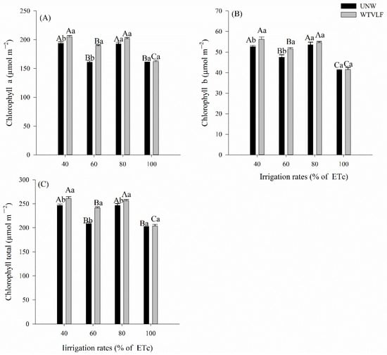 The interaction between the water type and irrigation rate significantly affected the content of chlorophyll a, b, and total (Figure 3). We can highlight that the behaviors of the 40 and 60% ETc levels were similar for chlorophyll a and b, in which the irrigation with WTVLF presented higher levels (p < 0.05). However, for the application of IDs of 80 and 100% ETc, the water types did not differ among themselves in terms of chlorophyll a and b (Figure 3A,B). The total chlorophyll content in the leaves showed an effect of the adopted water type, in which only the 100% ETc rate showed no difference (p > 0.05). Furthermore, analyzing the impact of ID, the concentrations of chlorophylls a, b, and total (Figure 3C) were higher in the function of the irrigation rates of 40 and 80% ETc.