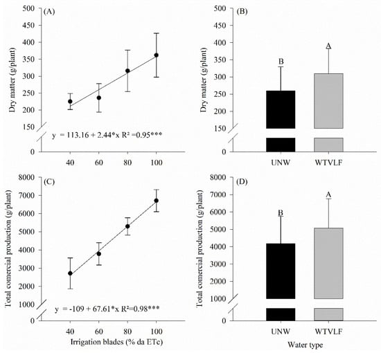 As with dry matter accumulation, commercial production showed no interaction between factors (Figure 4C,D). There was a linear effect of the irrigation rate, in which a 1% increase in ETc caused an increase in the production of 67.61 g plant−1 (Figure 4C). Regarding the applied water type, irrigation with WTVLF provided an average increase of 20% in production per plant (Figure 4D).