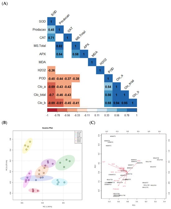 Figure 5B,C present the PCA and its components, respectively. We can observe that the irrigation rates of 40, 60, and 80% ETc irrigated with UNW had a greater influence on components of the activity of CAT, MDA, and SOD. It also had a lower weight of components related to chlorophyll contents. The component of POD activity was associated with the treatment of 40% ETc irrigated with WTVLF. In addition, the 100% ETc treatments with WTVLF and UNW were strongly influenced by the production component and total dry matter.