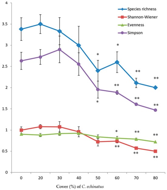 - Vilà, M.; Weiner, J. Are invasive plant species better competitors than native plant species? Evidence from pair-wise experiments. Oikos 2004, 105, 229–238. [Google Scholar] [CrossRef]